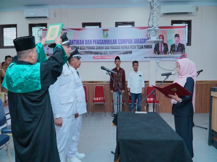 Tampak pada acara ini Pj. Sekda Kampar didampingi oleh Kepala Dinas PMD Kabupaten Kampar Lukmansyah Badoe, dan Camat Kampar kiri Marjanis serta beberapa undangan yang mengikuti prosesi pengambilan sumpah.