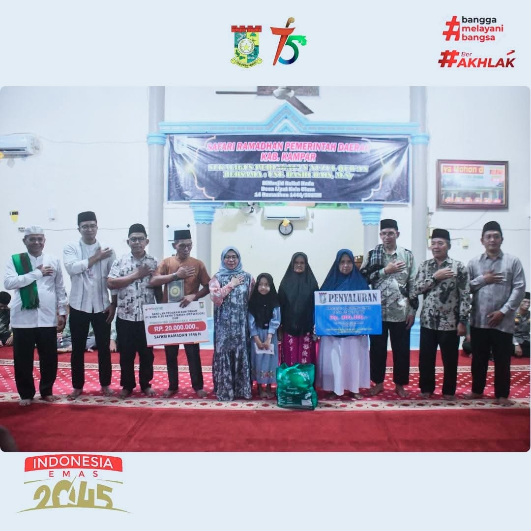 Wakil Bupati Kampar secara simbolis menyerahkan bantuan CSR dari Bank Riau Kepri untuk Masjid Baitul Huda Desa Lipat Kain Utara Kecamatan Kampar Kiri, bantuan sembako dan santunan anak yatim dari Baznas Kampar serta penyerahan Al Qur’an.